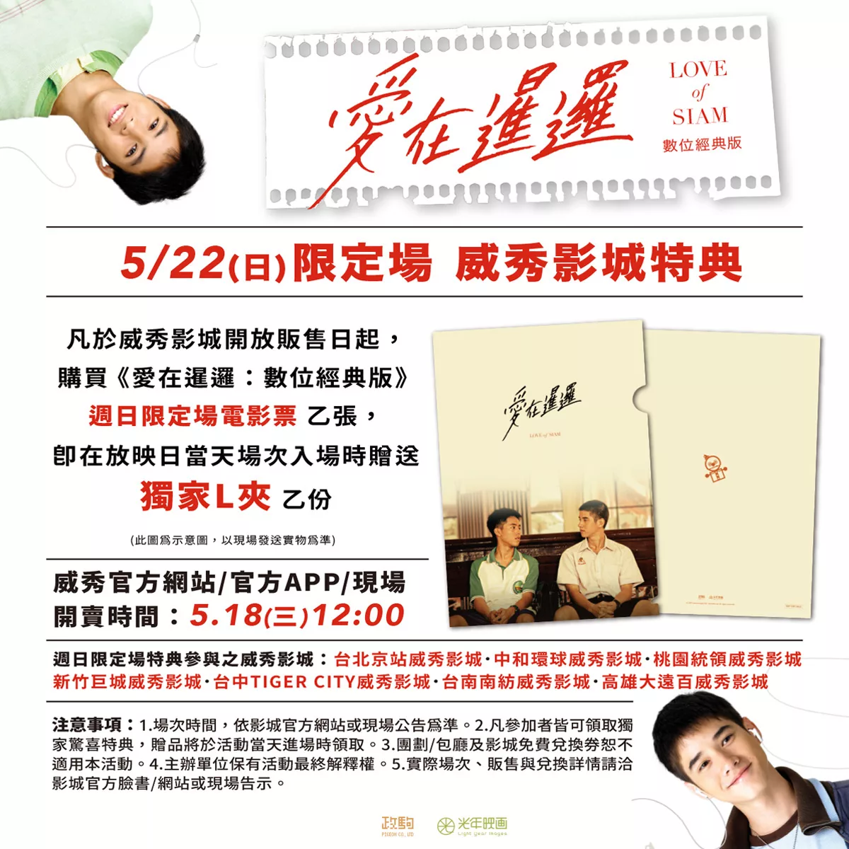 05/18(三)起凡購買桃園統領威秀影城或新竹巨城威秀影城【愛在暹邏:數位經典版】特別場電影票乙張,即可於入場觀影時,憑電影票根乙張獲得「特別版L夾」乙份。