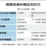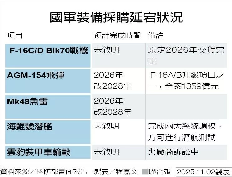 近年國軍裝備採購與營建工程,屢傳進度延宕。國防部最新書面報告證實,目前延宕的裝備,包括F-16戰鬥機、AGM-154空對地飛彈、Mk48魚雷、海鯤號潛艦、雲豹裝甲車輪轂。至於營舍、廠庫、陣地等工程,則有四案因履約爭議而延宕。