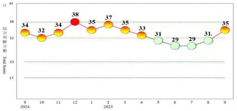 國發會9月景氣對策信號綜合判斷分數為35分,較上月上修值31分增加4分,燈號轉呈黃紅燈。9項構成項目中,股價指數轉呈黃紅燈、製造業銷售量指數轉呈紅燈,各增加1分,批發、零售及餐飲業營業額轉為黃紅燈,增加2分;其餘6項燈號維持不變。