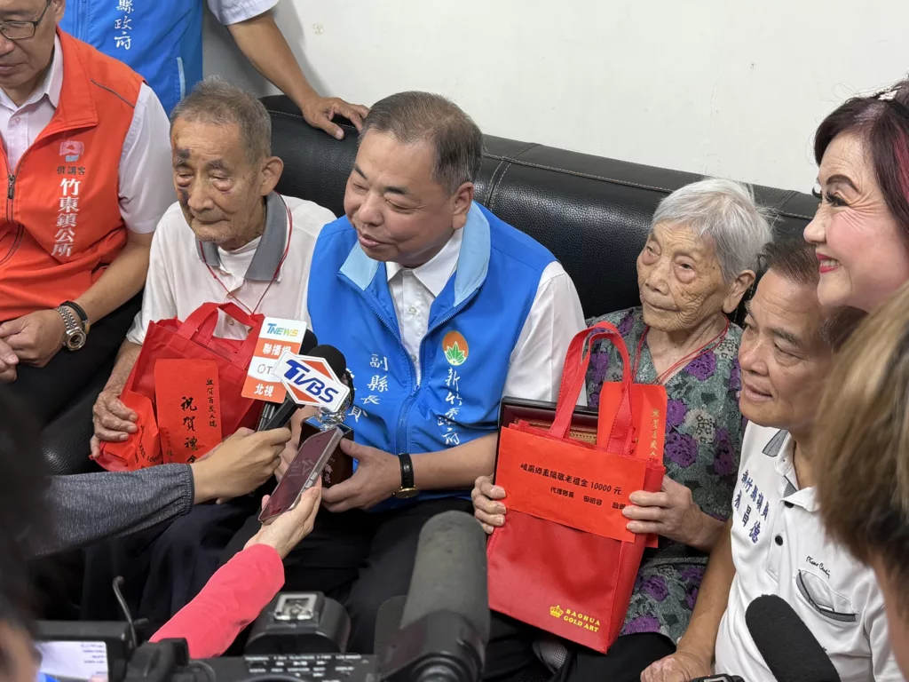 重陽節將屆,新竹縣長楊文科、副縣長陳見賢近日接連走訪北埔、峨眉、寶山、竹東等鄉鎮,拜訪縣內百歲人瑞,並致贈每位人瑞祝賀禮金1萬元、敬老狀、金鎖片等,而根據ETtoday民調,新竹縣平均滿意度88.3%,在十四項政策中,敬老卡擴大服務,獲得最高滿意度91.5%的肯定,從長者的開心看到縣府的作為。