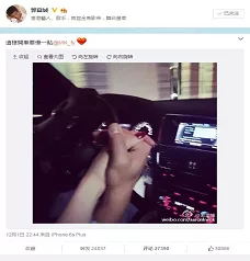 郭富城昨晚在微博上傳開車牽手照,寫「這樣開車要慢一點」,並直接標記方媛微博帳號,還在後面加顆愛心符號,公開認愛這段相差23歲的戀情。(中央社王靖怡/台北報導)